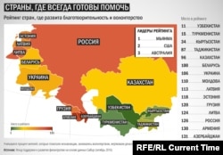 Фонд поддержки и развития филантропии CAF провел исследование человеческой щедрости и готовности помочь ближнему в 140 странах мира. Исследовалась как готовность людей отдавать деньги на различные благотворительные проекты и заниматься бесплатной волонтерской работой, так и простая готовность помочь незнакомцу - накормить его или поделиться с ним последней рубашкой.