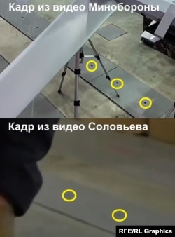 На видео Минобороны, опубликованном в октябре 2024 года, также есть несколько деталей, указывающих на то, что оно могло быть снято в выставочном центре "Патриот": например, металлические люки в полу с техническими отверстиями (их можно увидеть на складе техники "Рубикона" на видео Соловьева).