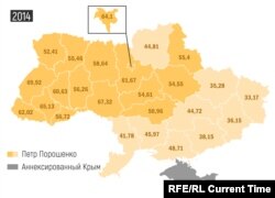 На территории Крыма провести голосование оказалось невозможным из-за аннексии полуострова Россией. Лишь около шести тысяч крымчан смогли проголосовать в других регионах Украины.
